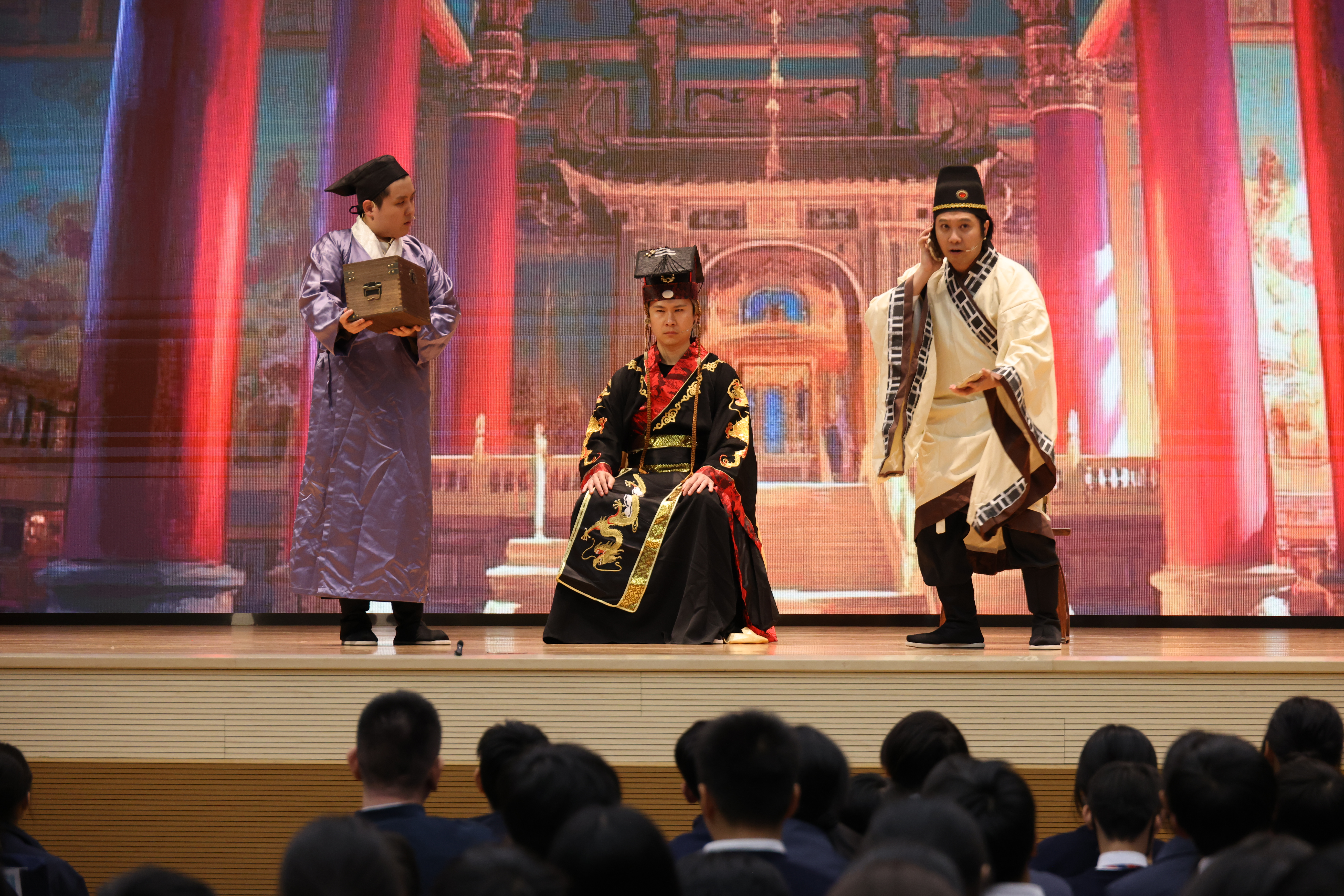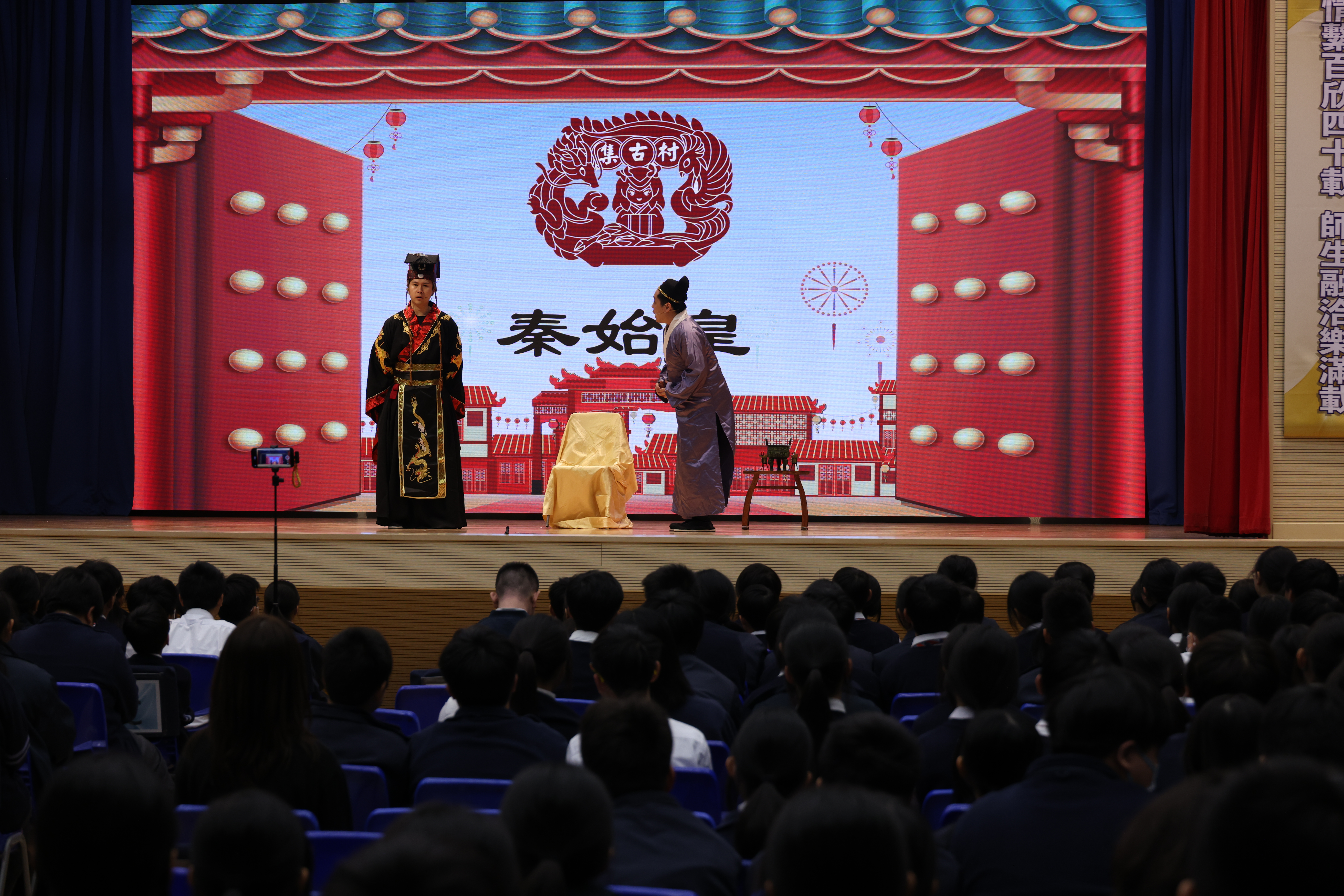 同學們身著華服,遊園嬉戲、互動打卡,笑語喧騰;師生一同在市集穿梭,於器物、服飾與遊戲之間觸摸傳統的溫度。活動壓軸更上演話劇《秦始皇的故事》,以生動演繹回溯歷史篇章,讓觀眾在劇場敘事中思索帝國興起與制度演變。